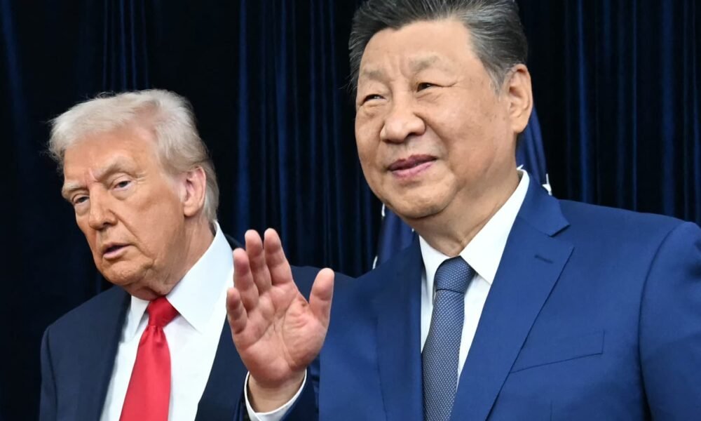 TOPSHOT – US President Donald Trump (L) and China’s President Xi Jinping arrive for talks at the Gimhae Air Base, located next to the Gimhae International...