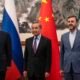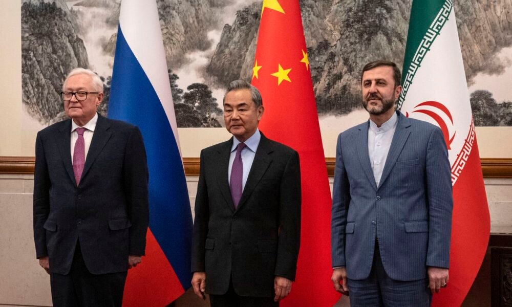 China’s Foreign Minister Wang Yi (C) welcomes Russia’s Deputy Foreign Minister Sergey Ryabkov (L) and Iran’s Deputy Foreign Minister Kazeem Gharibabadi before a meeting regarding the...