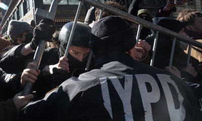 Immigration activists interact with NYPD as they block a garage used by ICE vans during a protest against a purported ICE raid on Canal Street on...