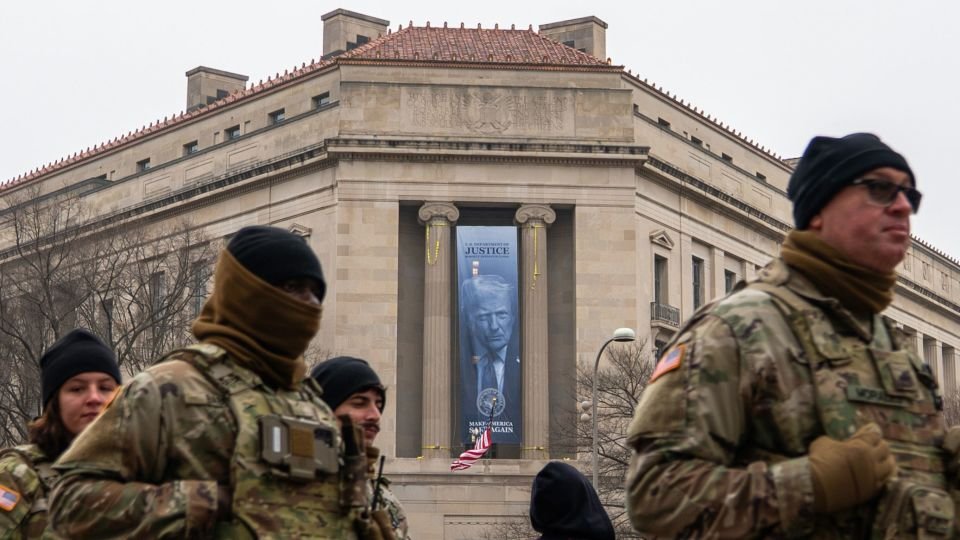A large banner of Donald Trump was hung outside of the Justice Department headquarters in Washington, DC, on Thursday, emphasizing the White House’s control over the nation’s top law enforcement branch that once pursued criminal prosecutions against the president.