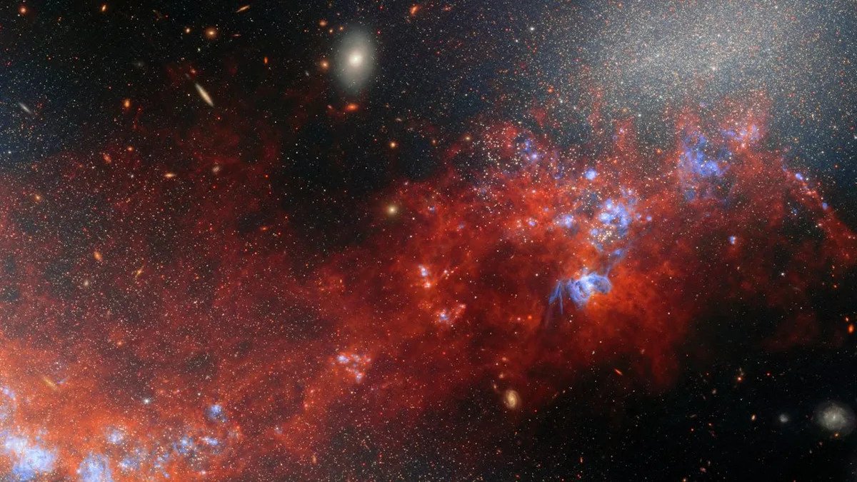 The larger galaxy, NGC 4490, sprawls across the frame in a tangle of dust and newborn stars, dominating the left side of the image. Its smaller companion, NGC 4485, glows off to the upper right. Connecting them is a bright bridge of gas and dust embedded with clusters of newborn stars, shining blue against the reddish glow of warm interstellar dust. It is the interaction between the two galaxies that spurred a burst of new stars, according to the statement.