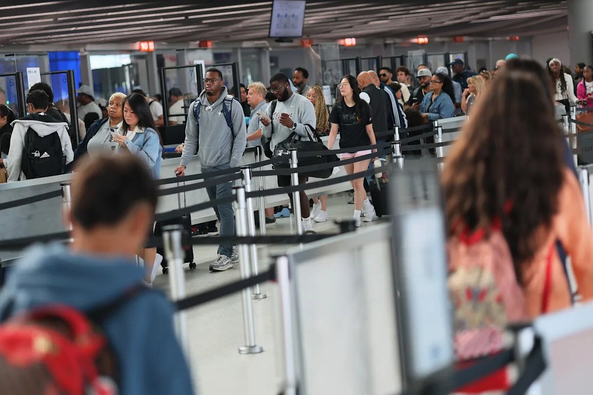 Michael M. Santiago/Getty Images – PHOTO: People wait in the security check in line in Terminal 5 at JFK Airport on August 29, 2025 in New York, New York.