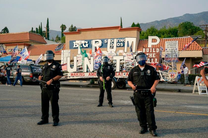 Los Angeles police officers attempt to stop a confrontation between Trump supporters and counterprotestors during a pro-Trump rally in Tujunga in 2020. (Kyle Grillot / AFP / via Getty Images)