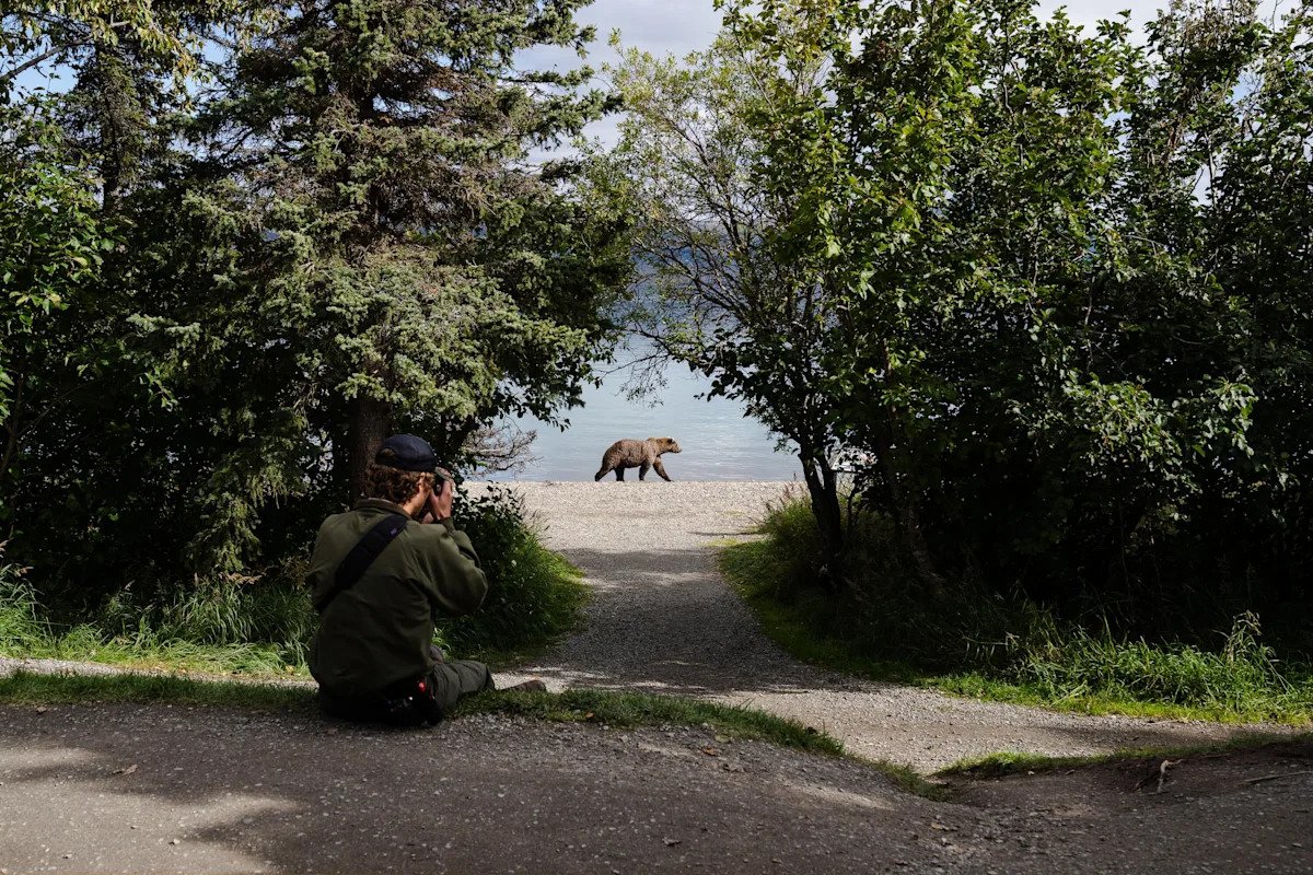 Lead Interpretive Ranger Keith Moore photographs a bear walking on the beach of Brooks Camp in Bristol Bay, AK on Sept. 22, 2023. As Fat Bear Week approaches, rangers work together to photograph the bears they need to. / Credit: The Washington Post/Getty Images