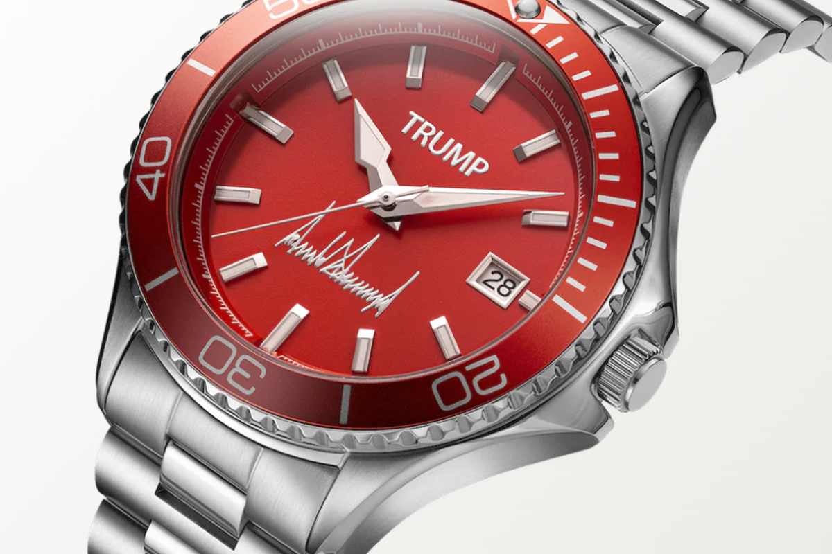 The watch in question is part of Trump’s “Fight Fight Fight Collection” and features a ruby red face with three dials, the slogan “Trump 45-47” (marking his two presidencies), and a copy of his much-discussed signature.