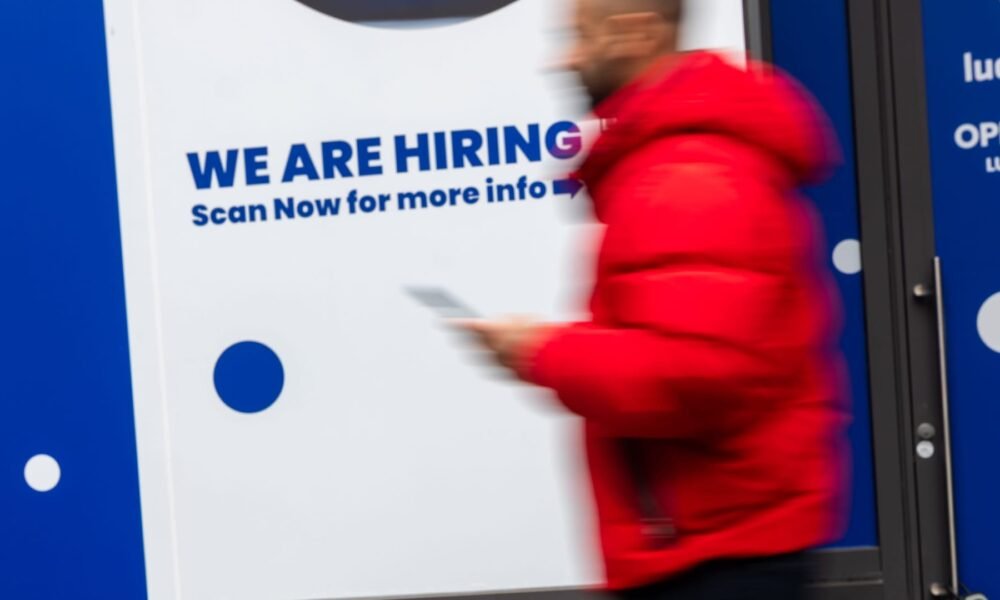 A ‘now hiring’ sign is displayed in a business’s window in Manhattan on Jan. 9, 2026, in New York City. Spencer Platt | Getty Images The...