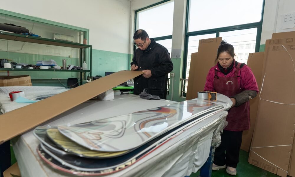 NINGBO, CHINA – JANUARY 22: Employees work on the production line of snowboards at a workshop to meet the orders on January 22, 2026 in Ningbo,...