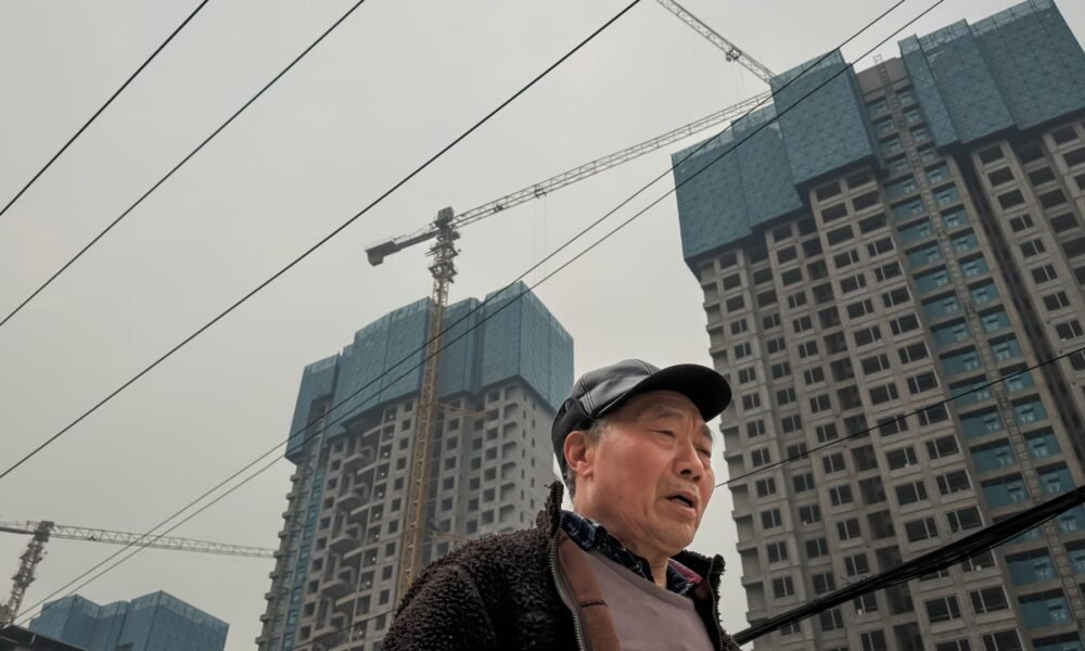 CHONGQING, CHINA – JANUARY 16: An elderly man walks along a street with high-rise residential buildings under construction in the background, where tower cranes and overhead...