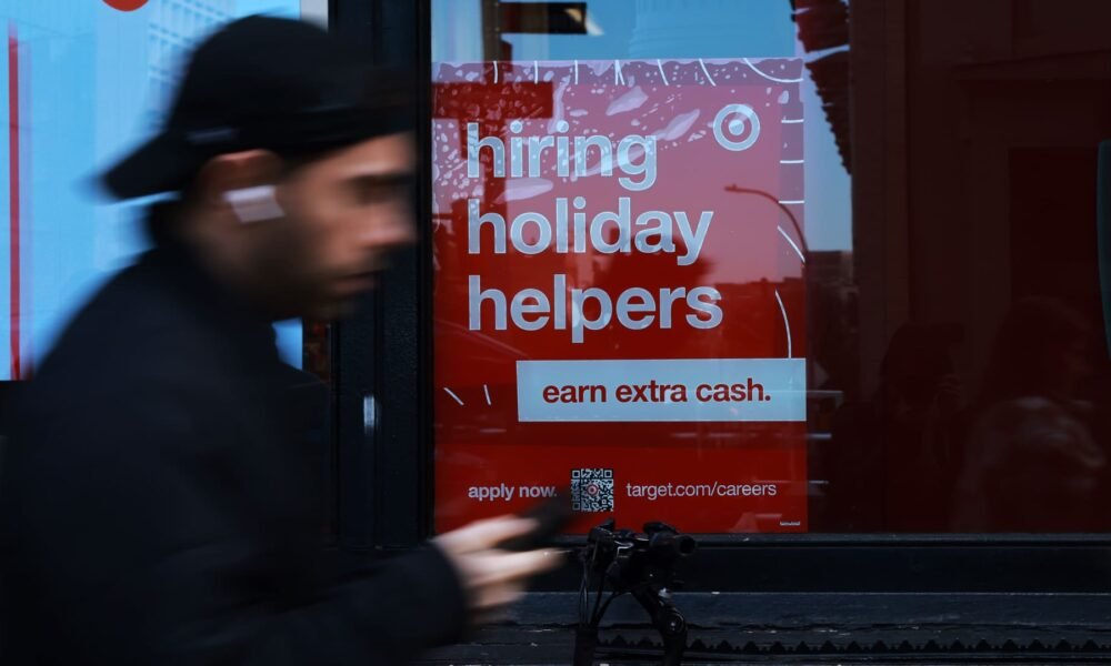 A hiring sign is displayed in the window of a business in Manhattan on Nov. 27, 2025 in New York City. Spencer Platt | Getty Images...