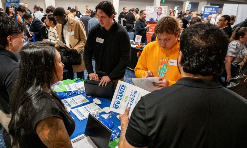 Job seekers speak with recruiters during the SacJobs Career job fair in Sacramento, California, US, on Thursday, Nov. 13, 2025. David Paul Morris | Bloomberg |...
