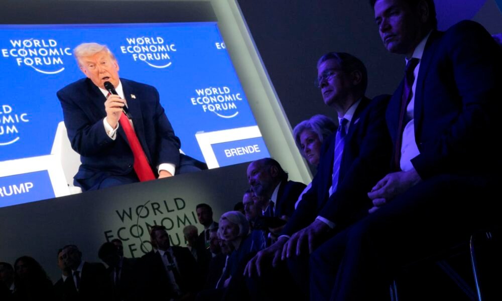 DAVOS, SWITZERLAND – JANUARY 21: Delegates watch as U.S. President Donald Trump speaks onstage at the World Economic Forum (WEF) on January 21, 2026 in Davos,...