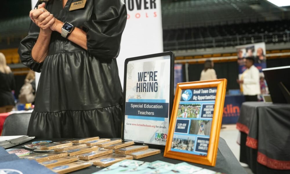A “We’re Hiring” sign at the Appalachian State University internship and job fair in Boone, North Carolina, US, on Friday, Oct. 24, 2025. Allison Joyce |...