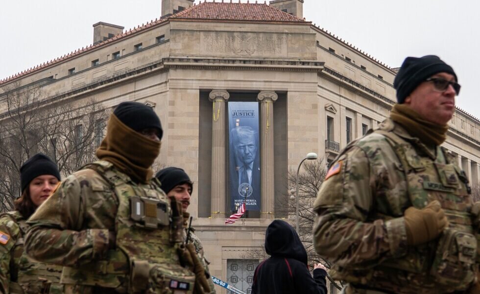 WASHINGTON (AP) — A large banner featuring Donald Trump’s face was hung on the exterior of Justice Department headquarters on Thursday in a physical display of...