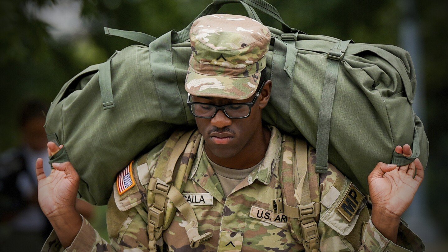 A member of the District of Columbia National Guard arrives at the District of Columbia National Guard Headquarters, Tuesday, Aug. 12, 2025, in Washington. (AP Photo/Julia Demaree Nikhinson)