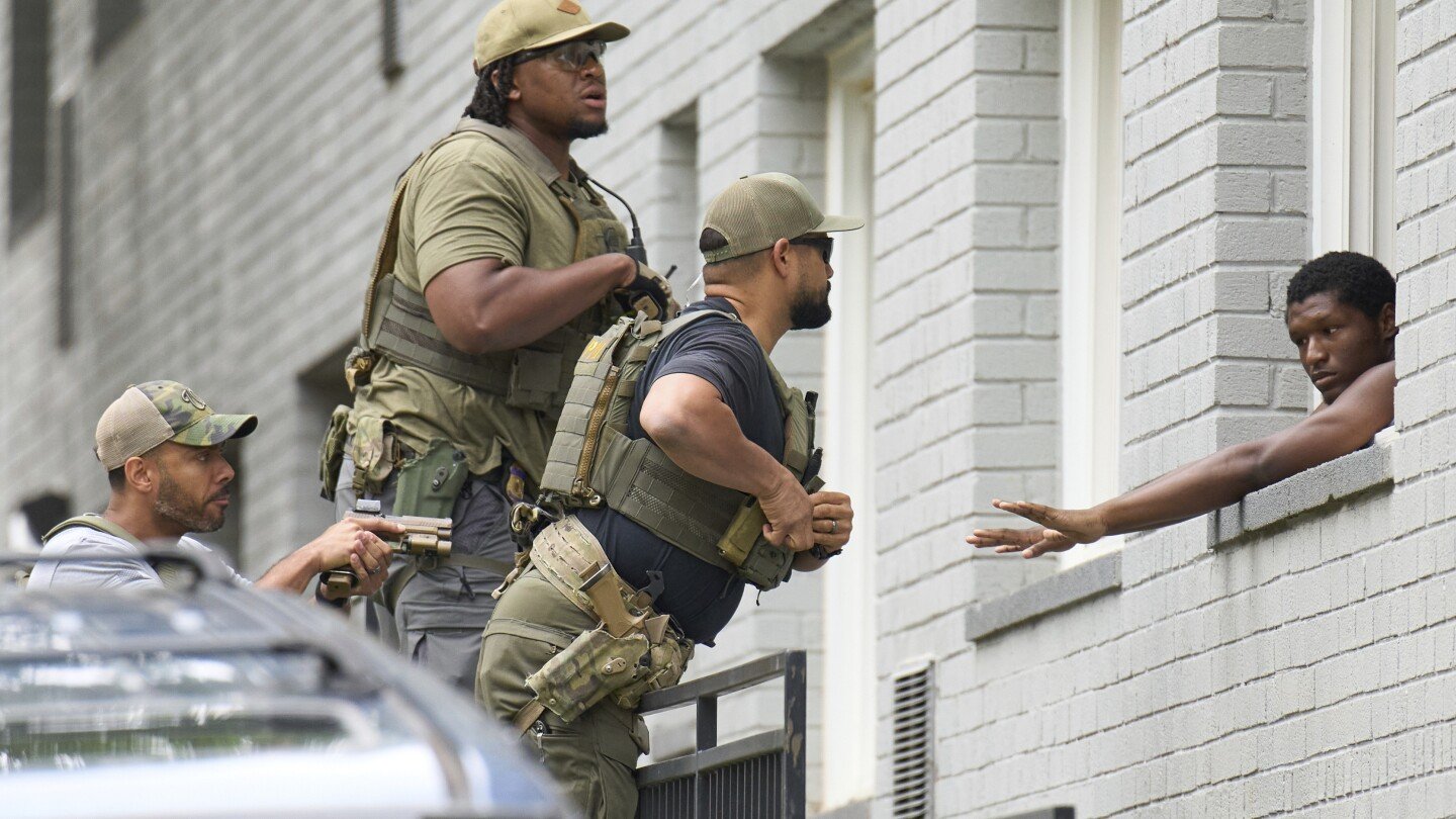 Armed officers from several federal agencies including U.S. Marshals, FBI, HSI, and Park Police, leave an apartment complex after arresting a man from within the apartment complex, Tuesday, August 19, 2025, in the Petworth neighborhood of northwest Washington. (AP Photo/Jacquelyn Martin)